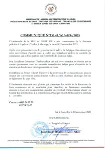L’Ambassade de la République Démocratique du Congo, près le Royaume de Belgique, le Royaume des Pays-Bas, le Grand-Duché de Luxembourg et Mission auprès de l’Union européenne, constate depuis quelques jours une campagne menée anonymement par voie de tract et démultipliée dans les réseaux sociaux qui apporte son soutien aux squatteurs de l’immeuble, situé au numéro 30, Boulevard du Souverain, Auderghem, à Bruxelles, appartenant à la Gécamines, Société Générale des Carrières et des Mines de la RDC.